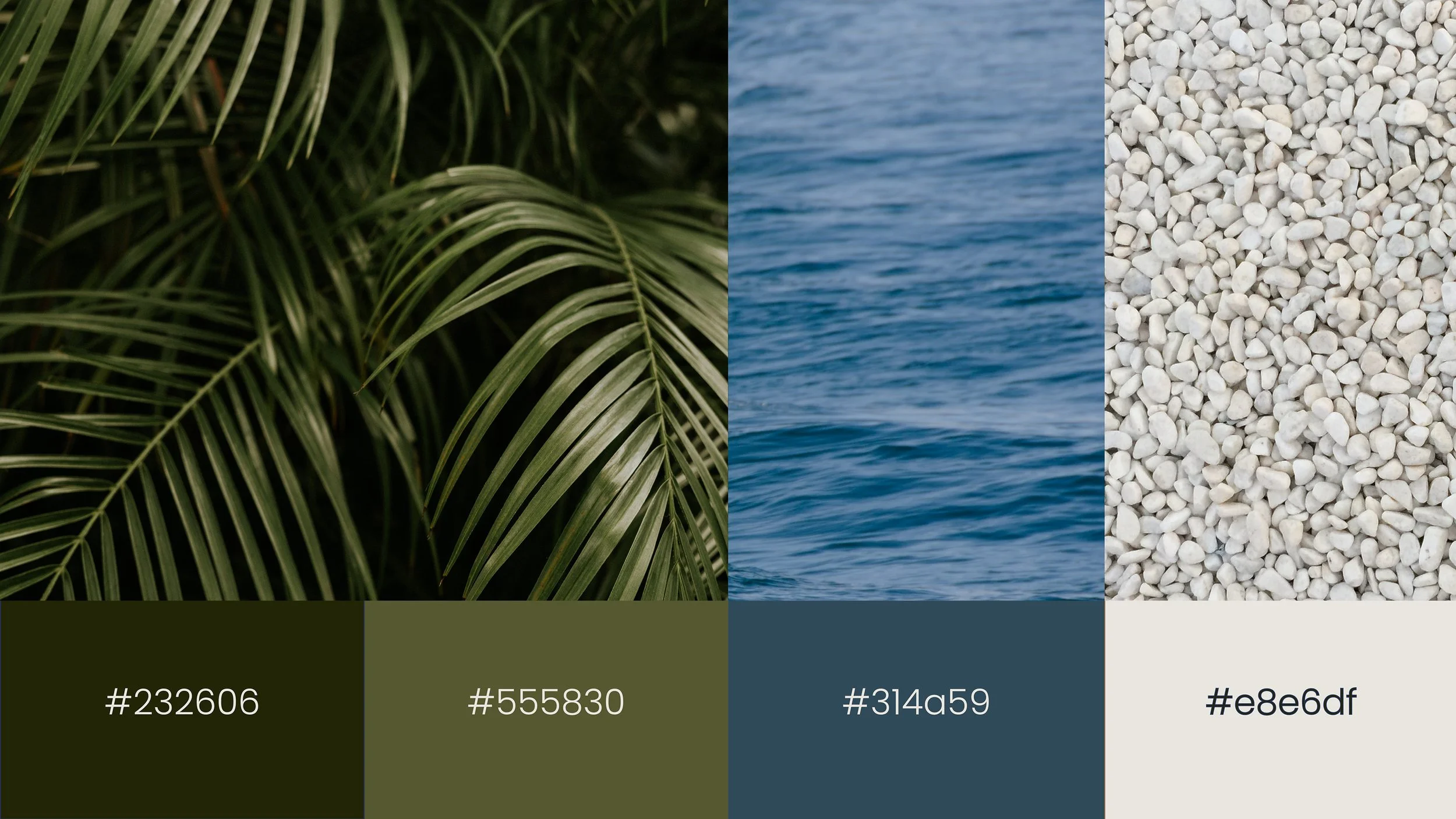 Inspired by the palm tree as a symbol of natural escape, the branding reflects calm, simplicity, and connection to the outdoors. The design combines a minimal palm symbol, modern typography, and a natural palette of green, blue, and sand tones to reflect calm, elegance, and a coastal retreat feeling